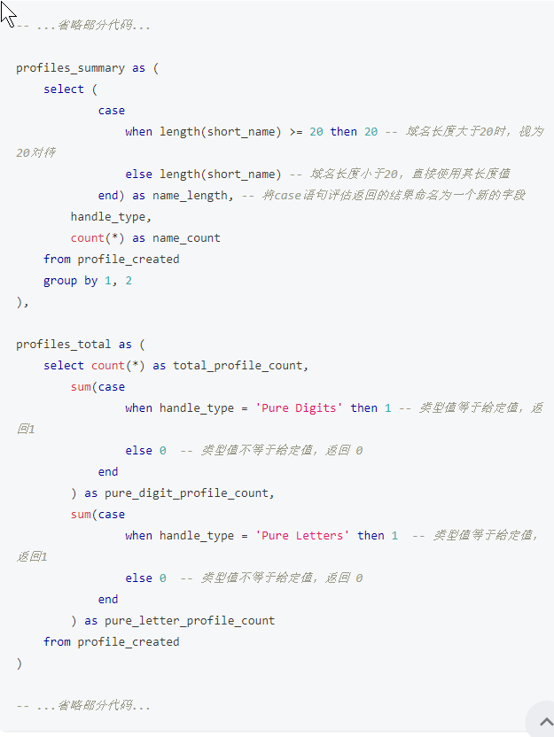 profiles_summary as ( select ( case when length(short_name) >= 20 then 20 -- 域名长度大于20时,视为20对待 else length(short_name) -- 域名长度小于20,直接使用其长度值 end) as name_length, -- 将case语句评估返回的结果命名为一个新的字段 handle_type, count(*) as name_count from profile_created group by 1, 2 ),