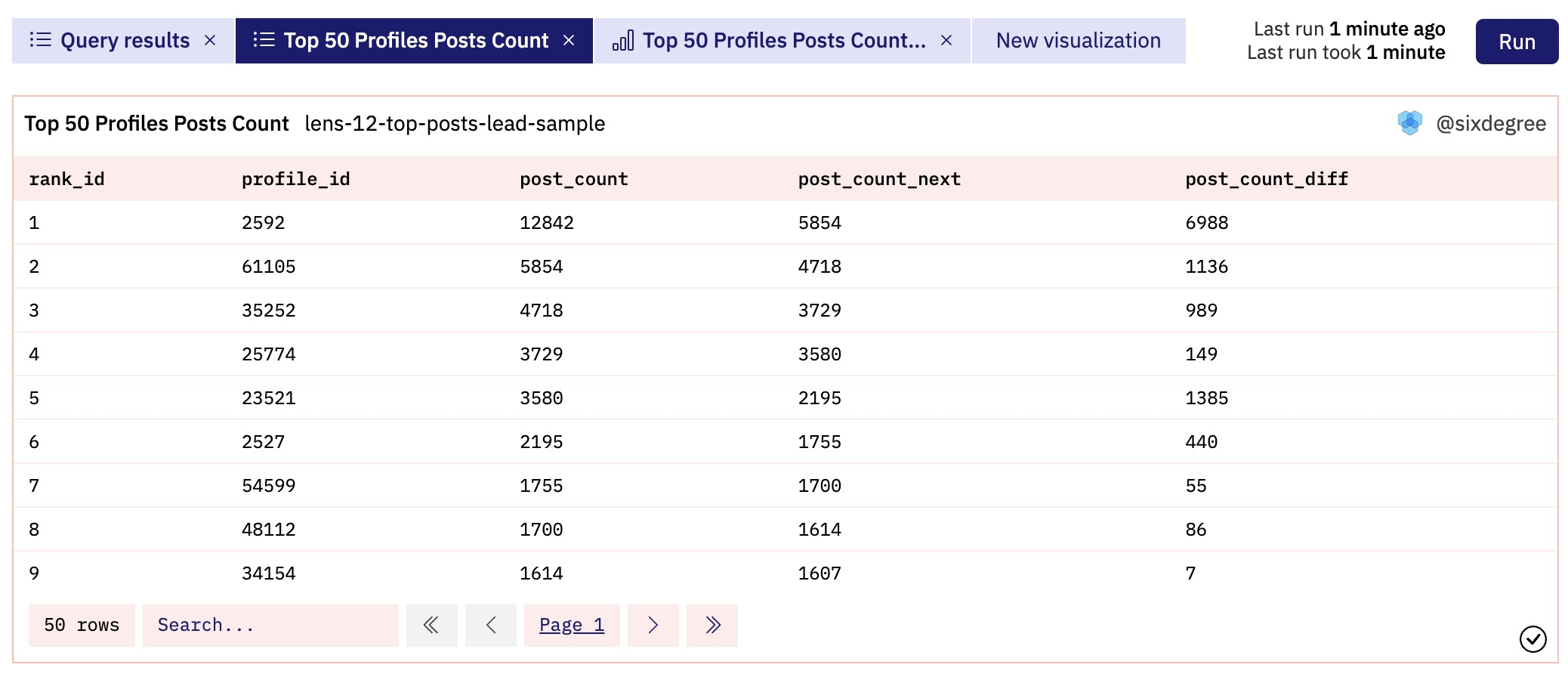 当我们需要向“前”对比不同行的数据时,就可以使用Lead()函数。比如,我们之前在Lens实例中介绍过发布帖子最多的创作者账号查询,我们将其做一些调整,返回发帖最多的50个账号,同时对比这些账号发帖数量的差异(第一名和第二名之差、第二名和第三名之差,等等)。关键部分查询代码如下: