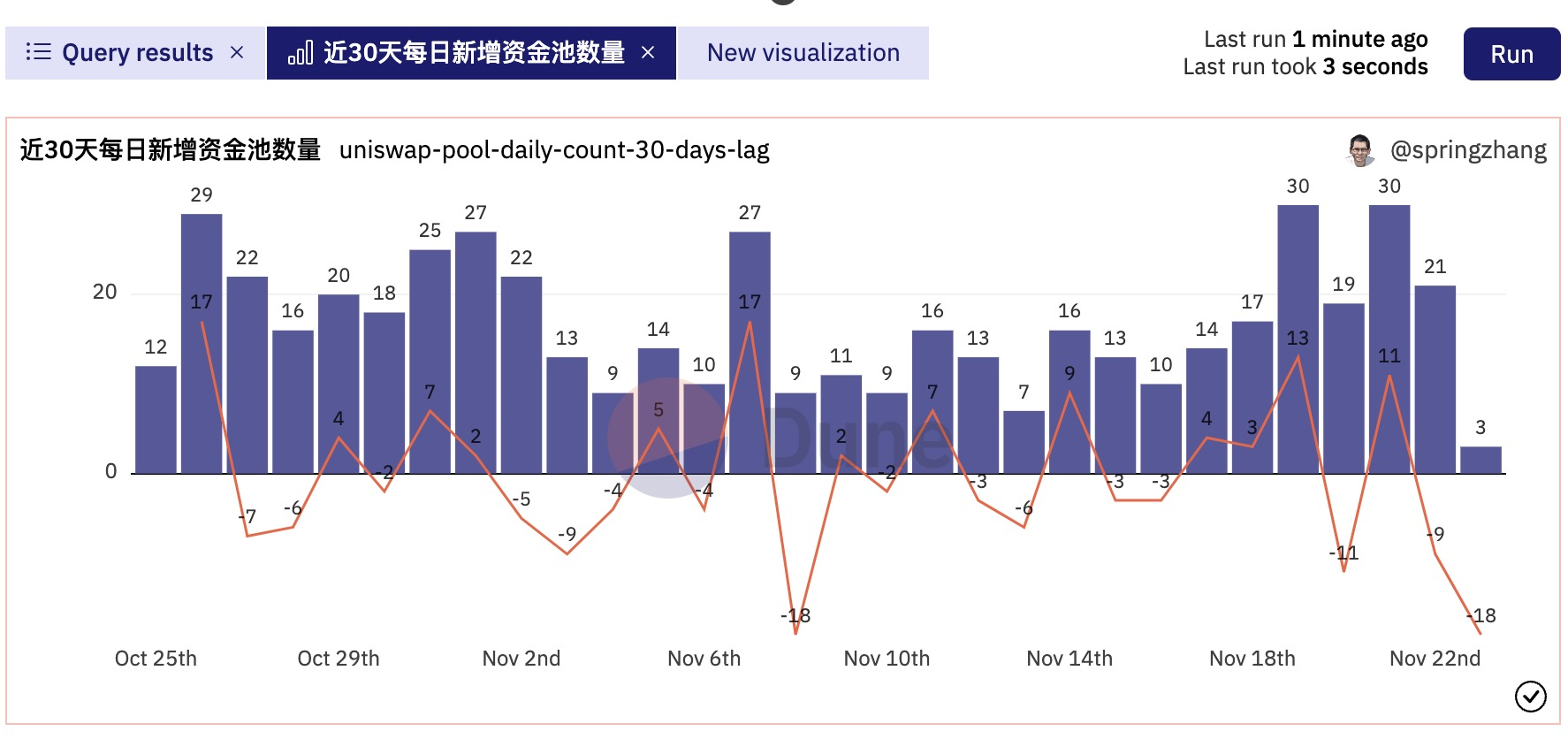我们之前的教程中介绍过一个查询,用于统计Uniswap V3 近30天每日新增资金池数量。其SQL为: