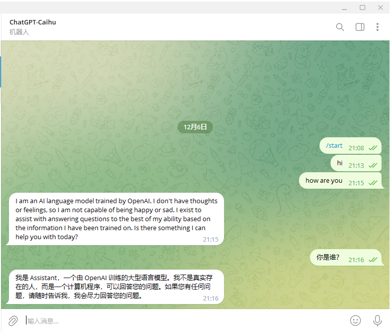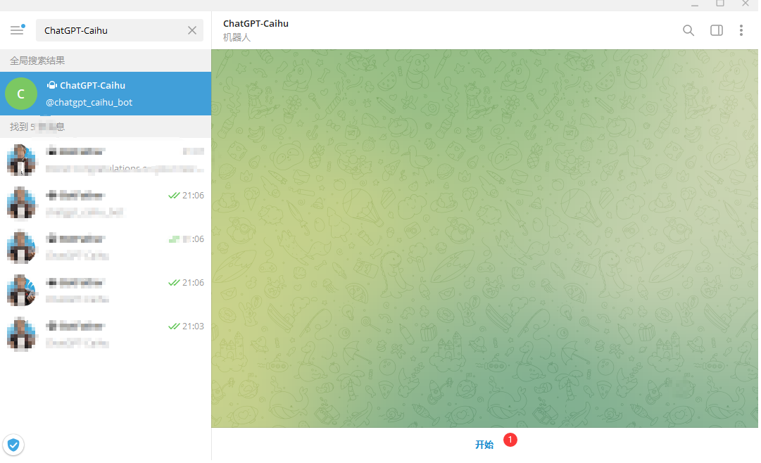 3)在电报中搜索刚刚创建的机器人 ChatGPT-Caihu ,然后点击开始。这样就完成机器人的创建了。