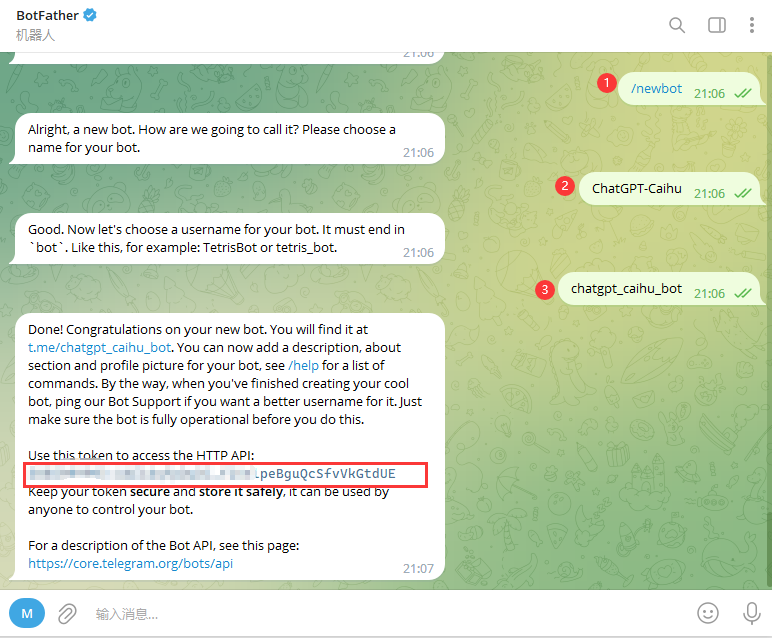 最后回复内容是机器人创建成功!红框内的字符串为该机器人的Token(重要信息不能轻易泄露给别人)。