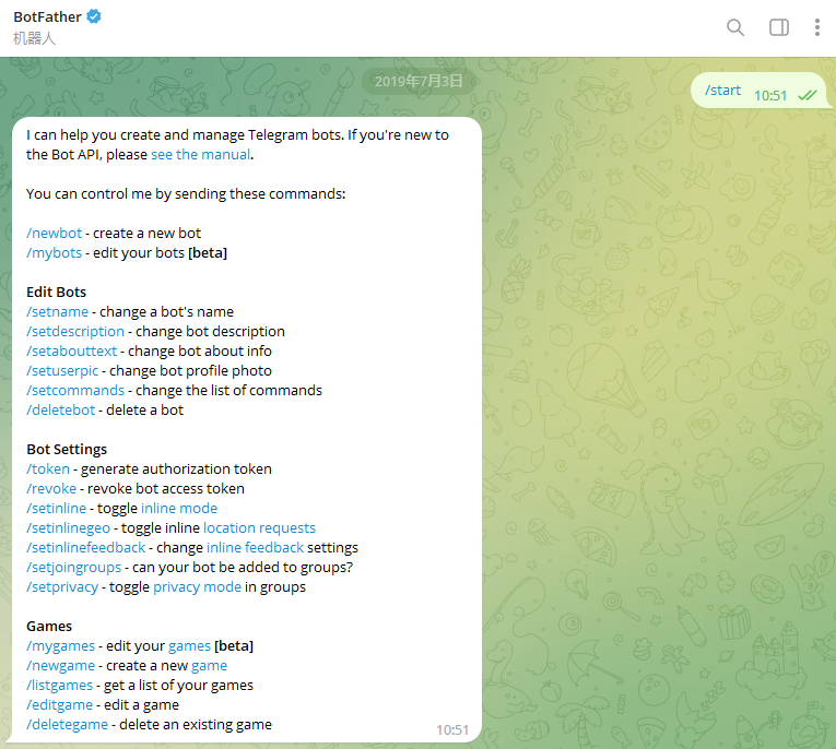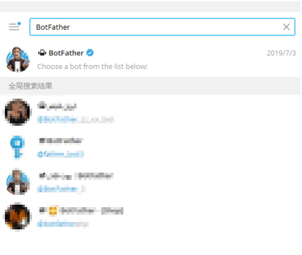 1)电报搜索 BotFather ,如图第一个。点击BotFather后,在对话框下方点击开始与BotFather对话,此时BotFather会列出来所有代码命令。