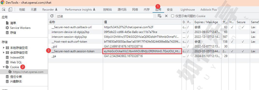 F12 - 应用 - Cookie - 找到 __Secure-next-auth.session-token 复制后面的值。