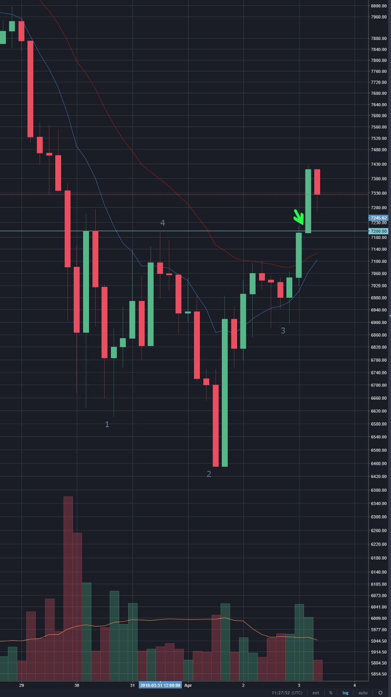 比特币目前处于一个明显的下跌趋势中,从两个低点(点1和点2)都比前一个低点更低可以证明这个结论。但之后有一个更高的低点(点3),经过许多低点之后,更高的低点会引起人们的广泛注意。
