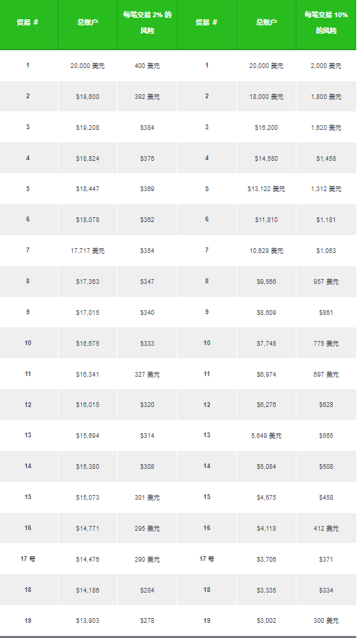 您可以看到,在单笔交易中拿账户的 2% 冒险与拿账户 10% 的风险相比,有很大的区别!