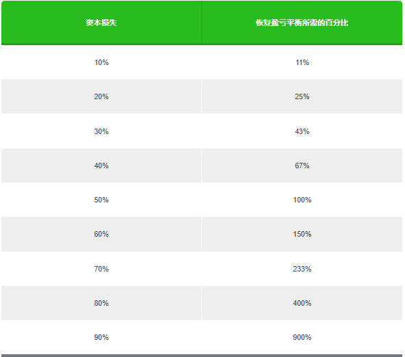 下表说明了如果您损失一定比例的账户资金,您需要达到多少百分比才能实现收支平衡。