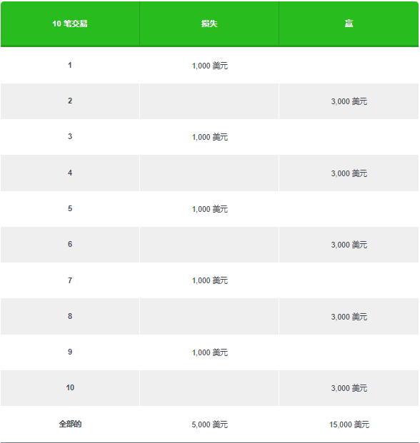例如,假设您有 10 笔盈利交易,每笔交易平均收益 200 美元,而 5 笔无利可图交易,每笔交易平均亏损 300 美元: