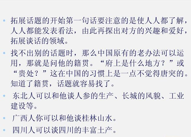 例如:“你是哪里人? "这个问题,当对方回答是山东,那么你就可以列举山东一些秀美的景观、对某些城市的认知等等,说不定对方会给出“当地人”的看法,纠正你的一些错误认识。例如,并不是所有广东人,都是什么都吃的。