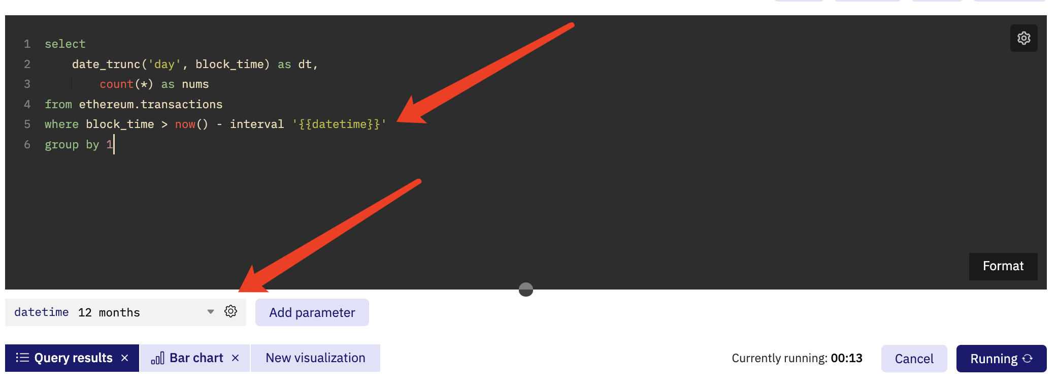 在query中还可以设置一个可变的输入参数,改变查询条件,比如可以设置不同的用户地址,或者设置不同的时间范围,参数设置是以'{{参数名称}}'