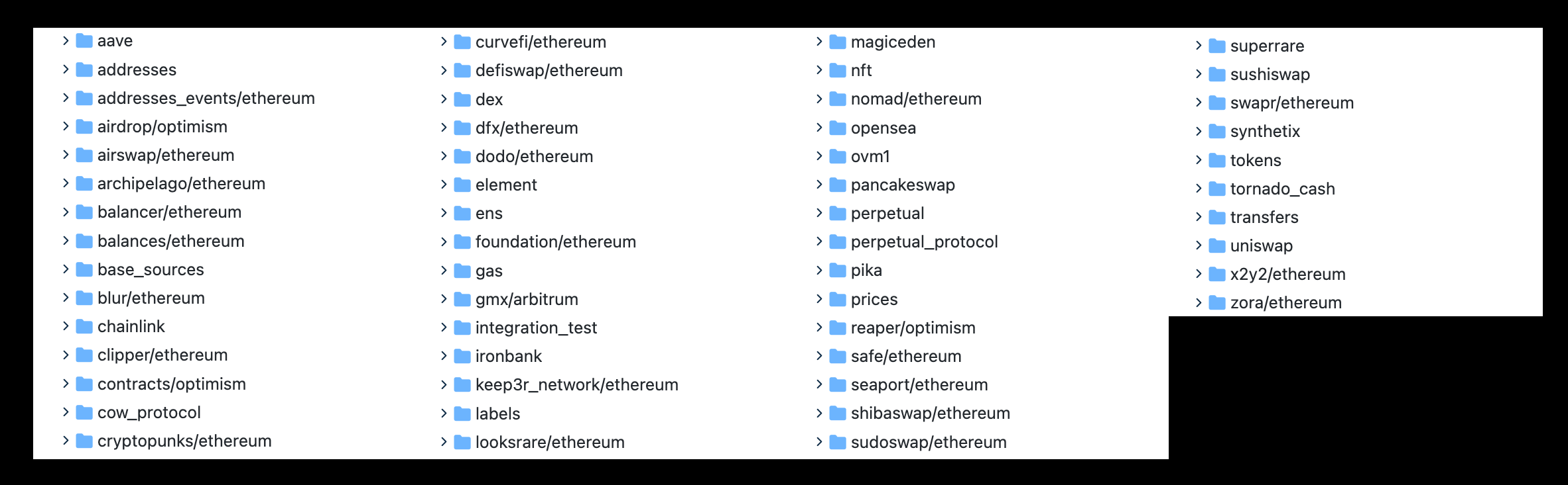 Decoded projects:各个项目/合约的直接解析表,解析出来的表会更加清晰易懂,如果分析具体项目用这里的表会更加合适