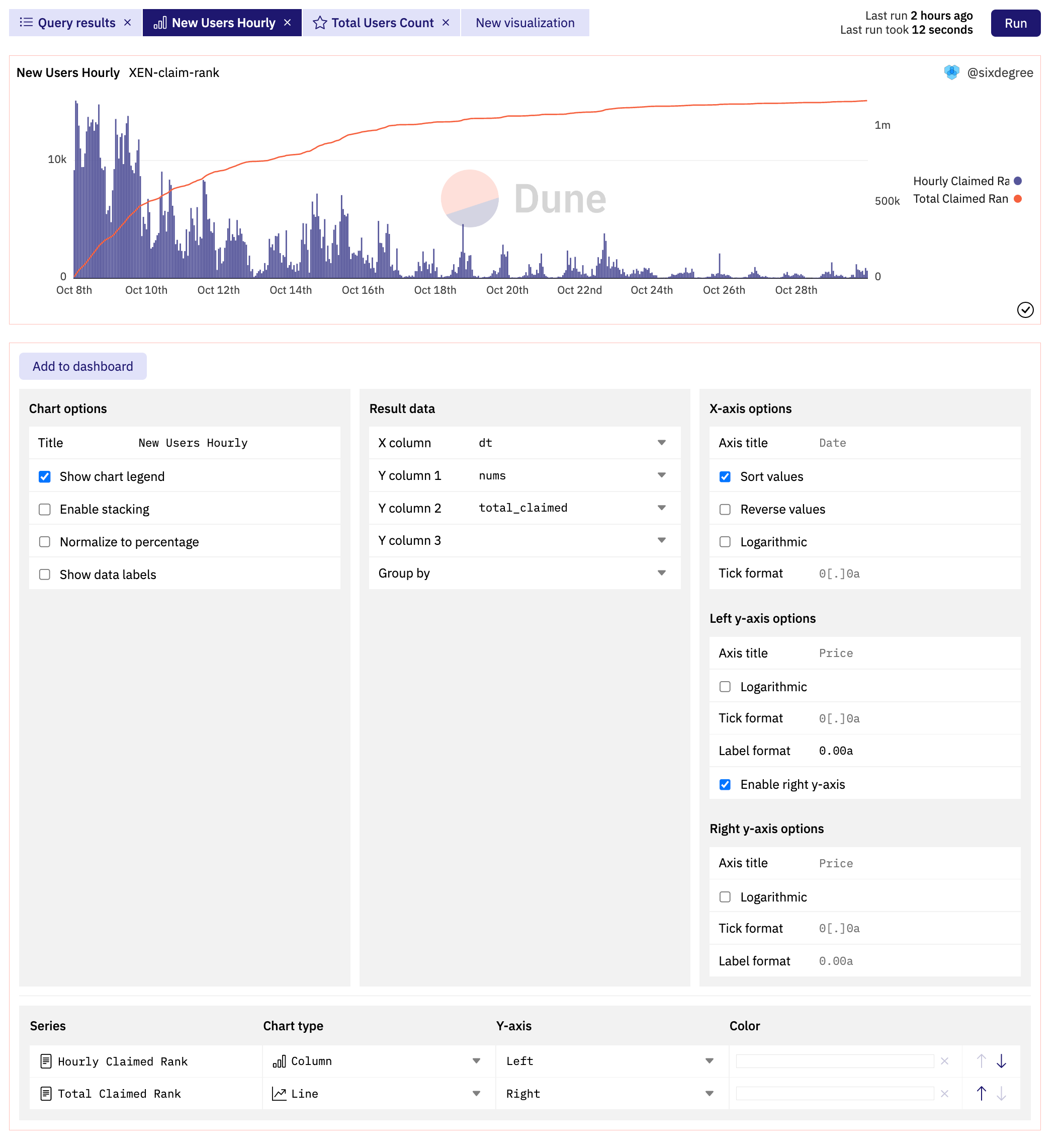 在图表可视化中,Dune平台提供了散点图、柱状图、折线图、饼状图、面积图和计数器以及二维数据表。在执行完查询,得到结果之后,可以选择New visualization