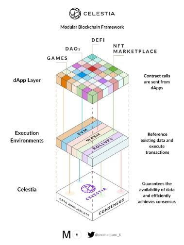 模块化区块链中讨论热度最高的是Celestia,Celestia是首个模块化区块链网络,区分出共识层与执行层不同的模块,供开发者选择执行环境开发和部署Dapp。