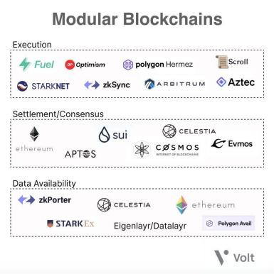 援引Volt Capital制作的模块化区块链图表,在执行层、共识层和数据可用性层都有分布新公链,执行层有Fuel、Scroll等,共识层有Celestia、Aptos等,数据可用性层有Polygon Avail,本文将摘取每个层次的代表项目进行介绍。