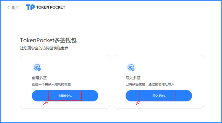 2、在弹出的新界面中,我们可以选择创建或导入多签钱包,我们模拟首次创建的情景。点击【创建钱包】。
