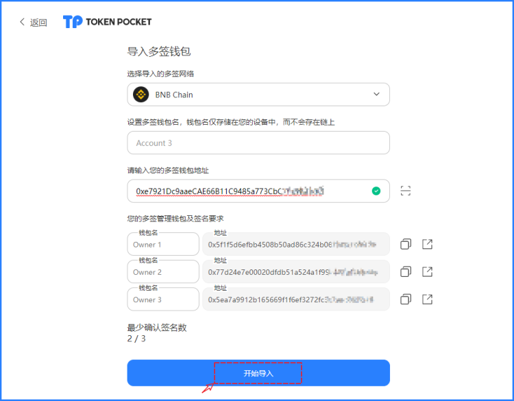 2.导入界面中输入自定义名称,填入【多签钱包地址】会自动读取到管理地址和最少确认签名数,点击【开始导入】即可导入到多签钱包中。