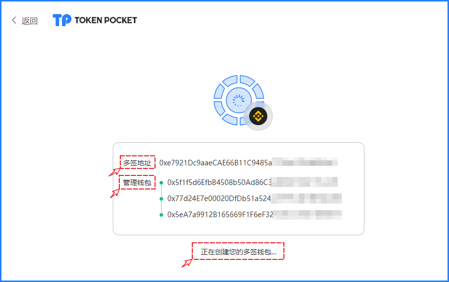 当一切设置妥当后,点击【确认】即可看到多签钱包创建中的提示,界面中可以点击跳转到BSC区块链浏览器上查看相关创建信息。