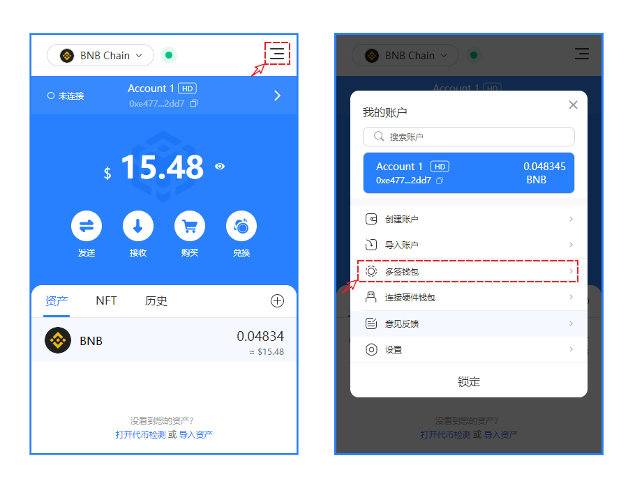1.打开TokenPocket插件钱包,点击右上角菜单选择【多签钱包】