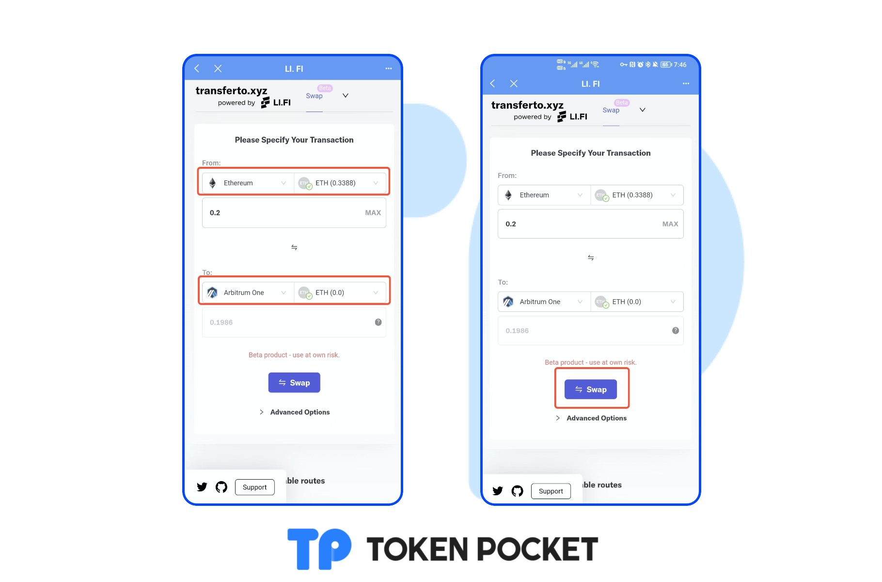 1.打开TokenPocket钱包,选择以太坊网络,切换至【发现】页面,选择LI.FI;或在发现页面输入”https://transferto.xyz/swap?fromChain=eth”。