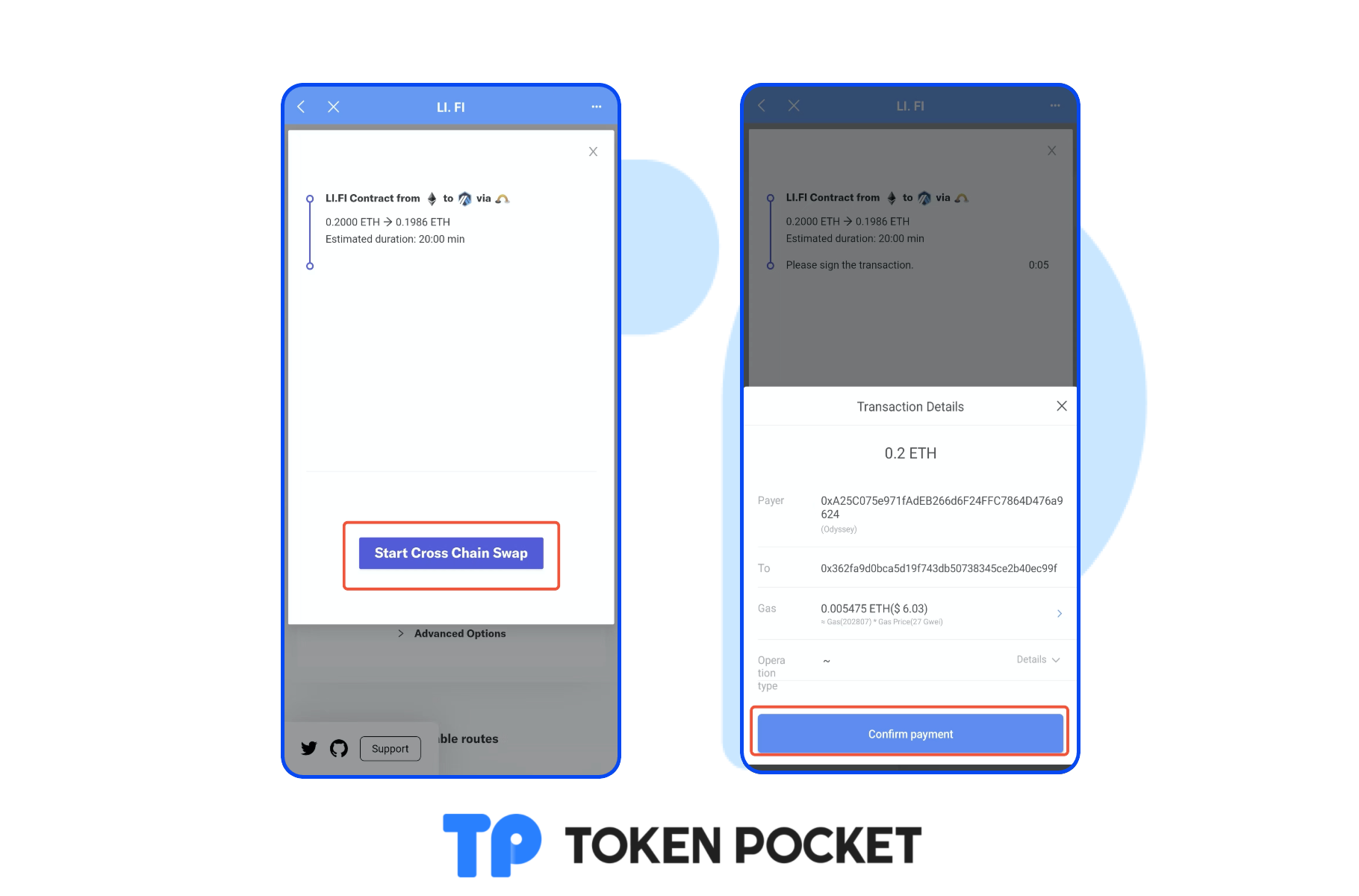3. 确认交易细节,点击【Start Cross Chain Swap】,点击【Confirm payment】(确认交易)进行确认。