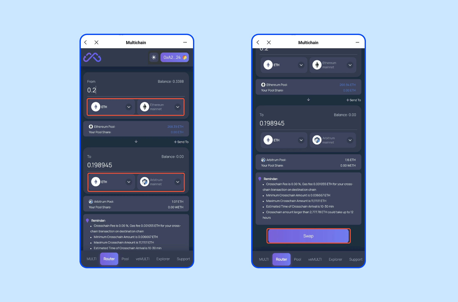 2.选择ETH,并输入数量,注意到账网络选择【Arbitrum】,点击【Swap】确认交易。