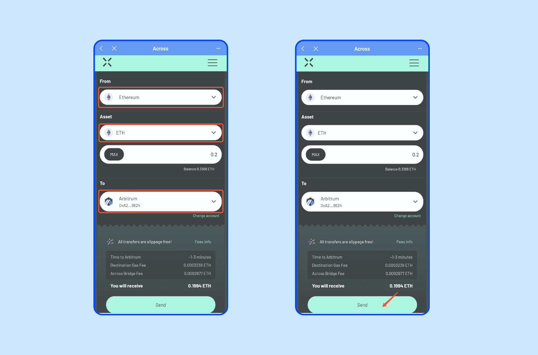 2.连接钱包后,选择ETH,并输入数量,发送网络选择【Ethereum】,到账网络选择【Arbitrum】,点击【Send】确认交易。