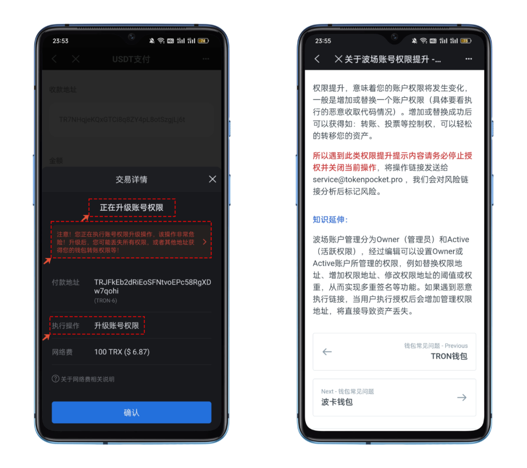 波场的权限提升和Approve(授权)是有着区别,授权后影响的只有授权过的这个Token;而权限提升则会导致波场地址权限的变更,从而失去了对地址的管理权限。