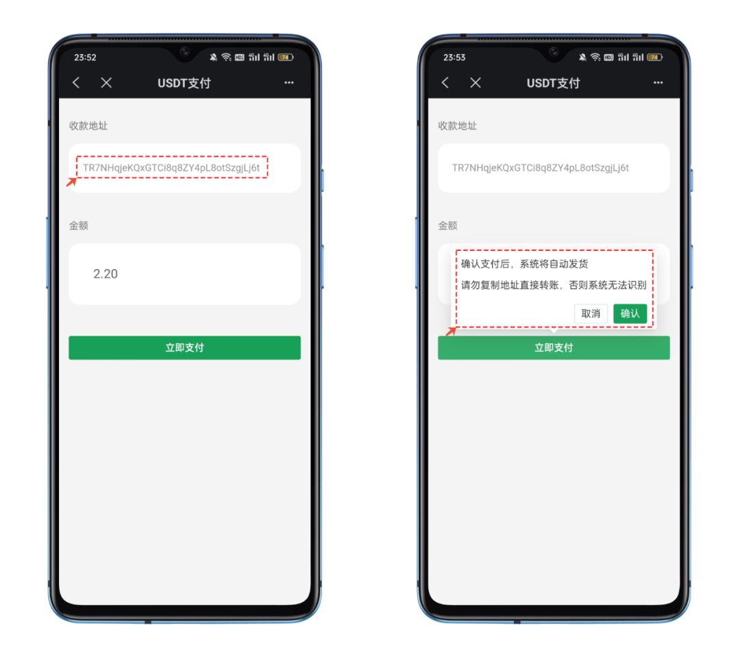 通过恶意网站的充值入口跳转到钱包中打开,收款地址填写的是USDT的合约地址,如果细心的人会发现异常。点击立即支付,提示不要复制地址进行转账,这个是为了防止用户绕过恶意代码执行转账。