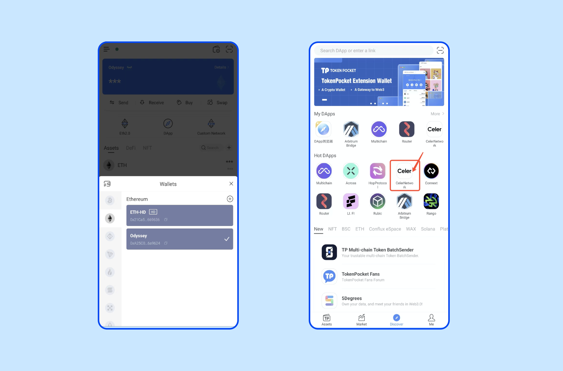 1.打开TokenPocket钱包,选择以太坊网络,切换至【发现】页面,选择CelerNetwork;或在发现页面输“https://cbridge.celer.network/”。