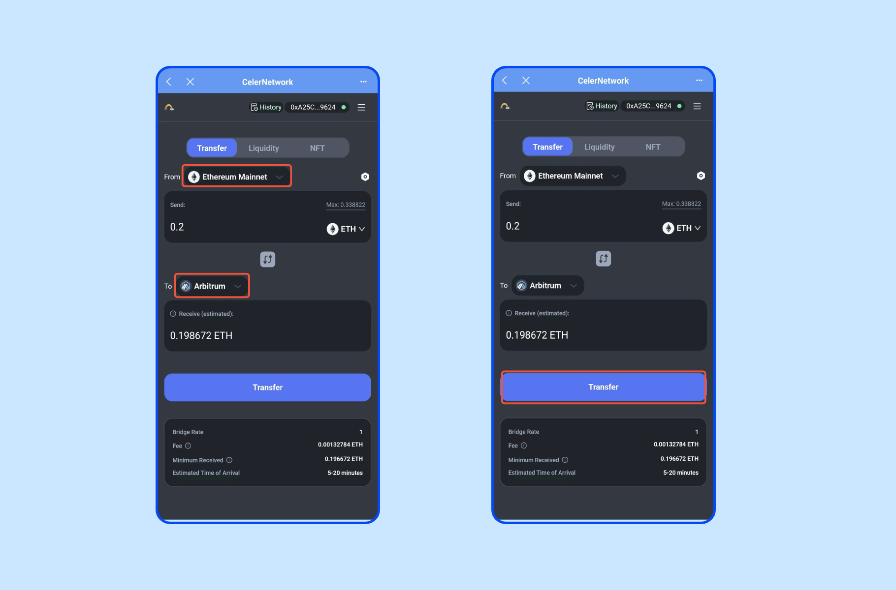3.选择ETH,并输入数量,发送网络选择【Ethereum Mainnet】,到账网络选择【Arbitrum】,点击【Transfer】确认交易。