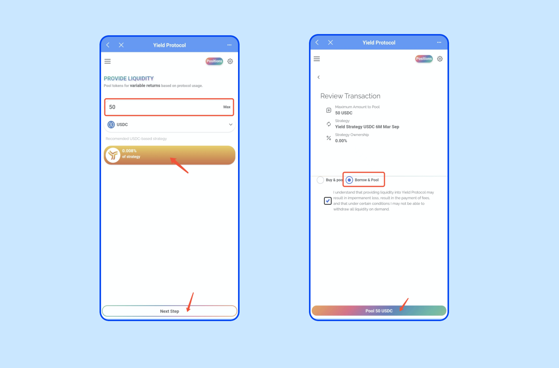 提供50USDC或以上,點擊【Next step】,选择【Borrow & Pool】,点击【Pool 50 USDC】,完成流動性提供。