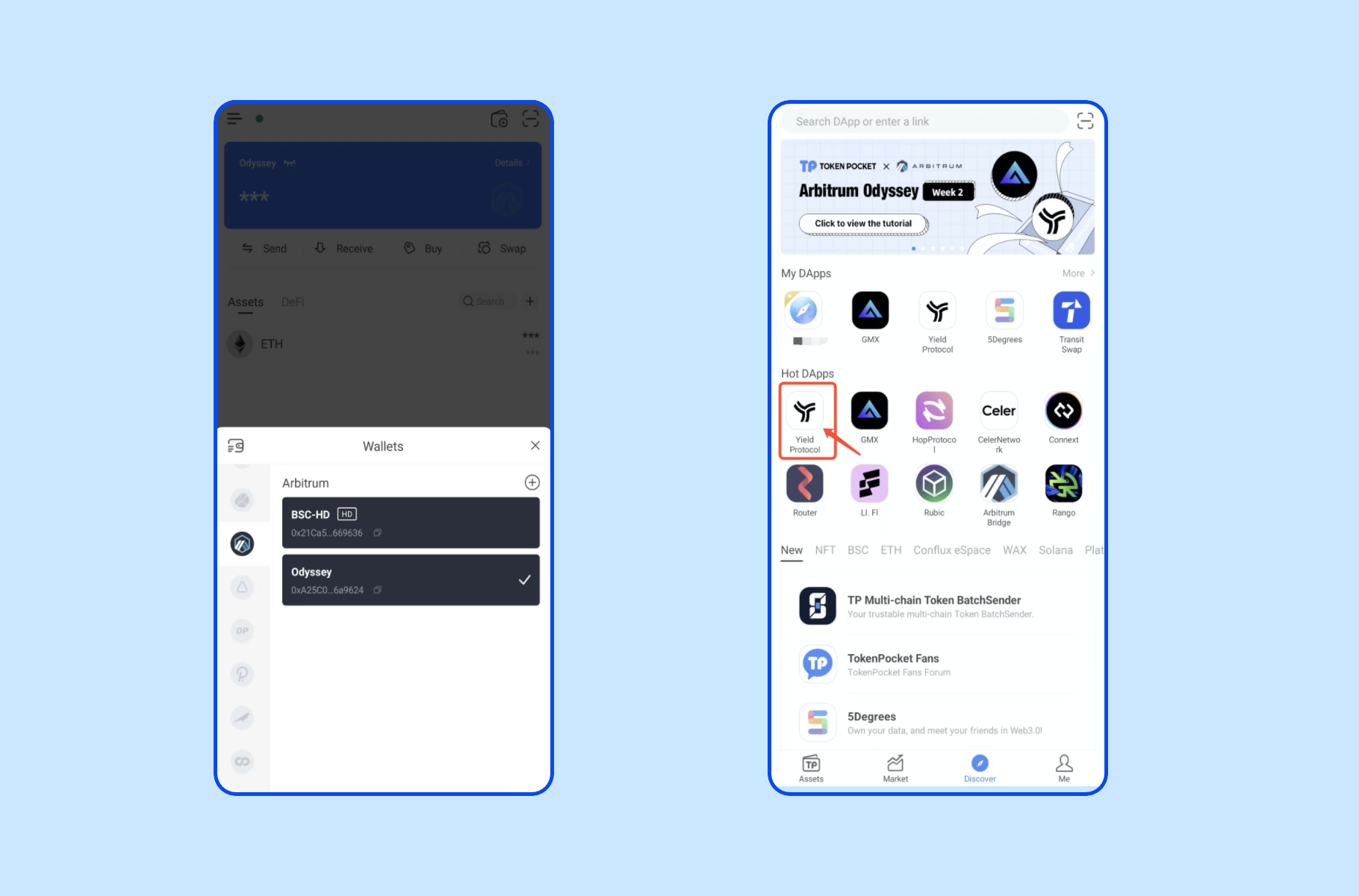 打開TokenPocket錢包,選擇Arbitrum網絡,切換至【發現】頁面,選擇Yield Protocol;或在發現頁面輸入“https://app.yieldprotocol.com”。