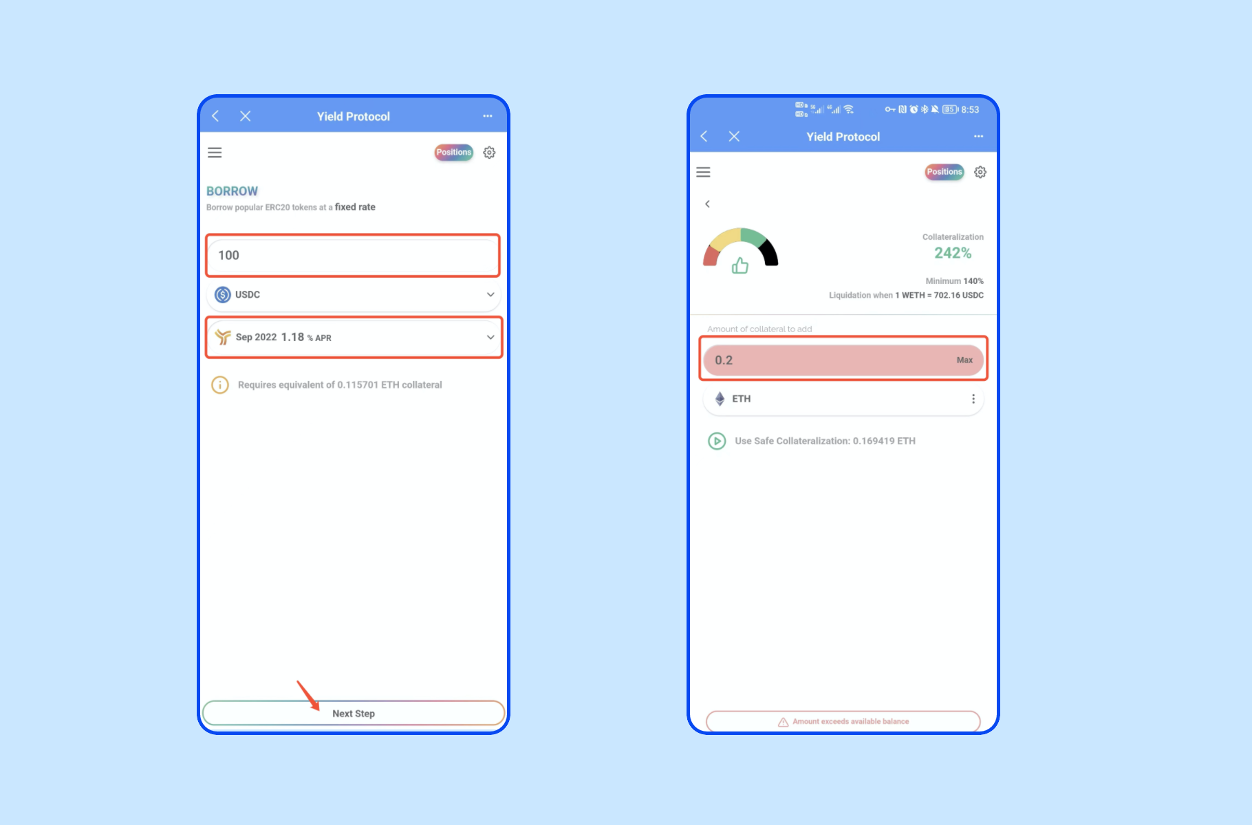 選擇借出100或以上的 USDC, 點擊【Next Step】,目前只支持ETH 和DAI做為抵押,抵押代幣種類還是比較少。準備好抵押物。根據提示輸入ETH 抵押數量(不可抵禦最小值),點擊【Next Step】。後進行簽名確認,即可完成!