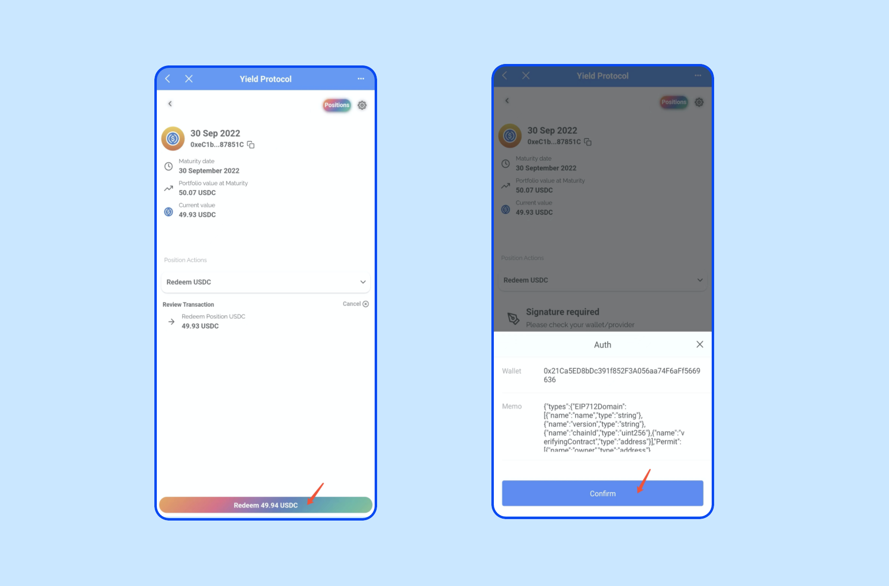 3.點擊【Redeem 49.94USDC】,點擊【Confirm】並完成簽名,即可贖回。