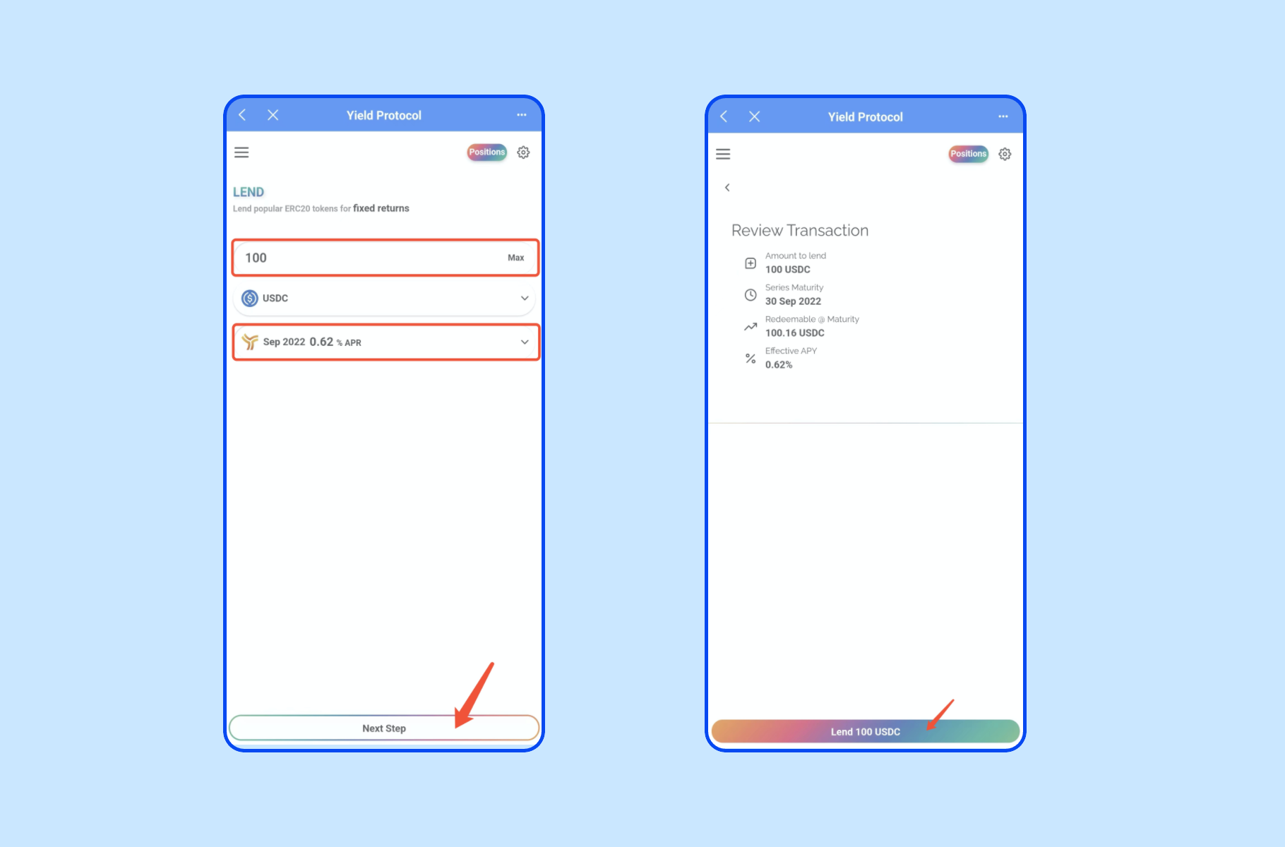 借出100USDC,選擇APR,點擊【Next step】,預覽交易記錄,點擊【Lend 100 USDC】。