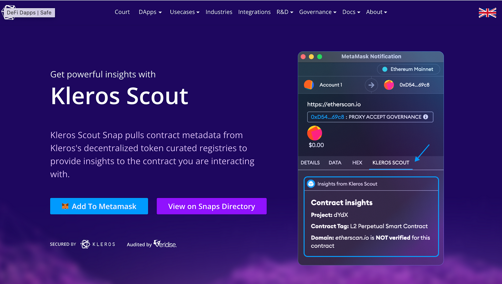 Kleros Scout is the first Snap on Metamask that supports Signature Insights. It decodes the content of signature requests and identifies the addresses of any contracts you may be authorizing in the signature via Kleros’s decentralized token curated registries. It can then warn you if the contract you are interacting with is malicious. Is also used by Ledger and on Token Curated Registries