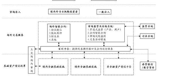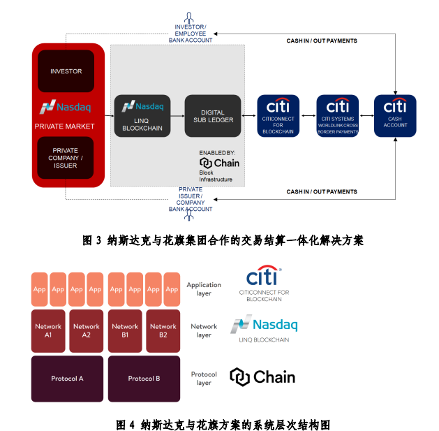 如图所示,为提 供跨现货账册和证券账册的交互,该系统与纳斯达克相关系统类似, 也采用了分层的体系结构,分别由安泉资本、德勤和纳斯达克等不同 的技术供应商实现不同层级的原型交互系统。