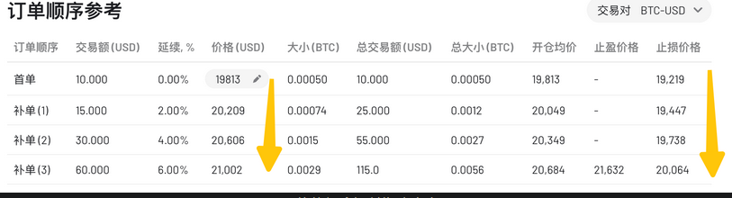 %最后一笔订单开仓均价:最后一笔补单成交后,价格继续朝着亏损方向变化超过该百分比时将下止损单。需要注意的是,因为一些原因导致所有的补单未成功执行,最后一笔订单则为首单