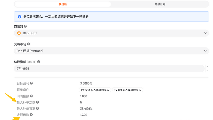 机器人进行交易的时候,我们不会无限加仓,每次加仓倍数也不一定是 2 倍,这都是非常灵活的。如下图所示,这个机器人设置的最大加仓次数(最大补单次数)是 5 次,每次投资金额是上次的 1.33 倍。
