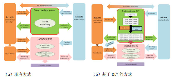 X 发布名为“分布式账册的交易撮合处理应用研 究”报告,其中讨论了将分布式账册技术应用于机构间交易撮合的可 行性。其中,东交所机构间交易撮合传统处理方式如图(a)所示, 其中卖方机构向买方机构发送订单执行的情况(交易确认),包括相 应的佣金。作为响应,买方输入在账户(二级账户)中分配的结果,并将结果返回给卖方。卖方根据分配结果对佣金分仓,并将该结果返回给买方。如果双方的数据匹配无误,则撮合成功。之后,买卖双方 使用日托管结算(JASDEC PSMS)提供的交易撮合规程,提 交(达成交易的)合约数据。一旦受托银行确认交易结果,会自动产 生双向结算数据。双方的撮合匹配是按照常行结算 SSI (standing settlement instruction)级别。