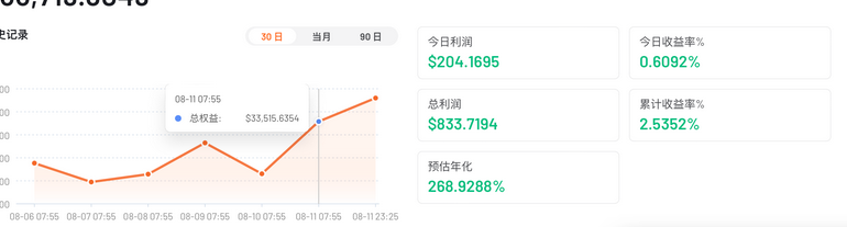 总利润:选定日期范围总利润,总利润 = 当前权益 - 初始权益 + 累计转出 - 累计转入,默认统计最近 30 日的,你可以在图表上方切换