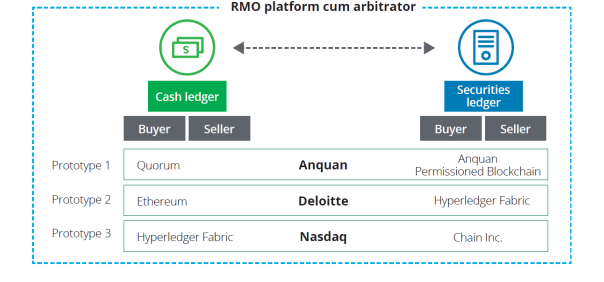 各层的原型交互系统由 供应商的商用系统构建,根据采用的具体技术实现向上层提供不同性 能和功能的互联互通。其中纳斯达克和德勤主要负责实现基于集中式 订单簿撮合的工作流,安泉资本主要负责实现基于 OTC 的工作流。 基于智能合约的 DVP 确保了流程中权力和责任的一致性和完整性, 减少了市场整体的信任成本。交易所作为一个 RMO(认证市场运营 人)和仲裁人,负责监察和维护市场正常功能。现货账册是由央行维 护的数字化新币资产账册,证券账册是由交易所维护的代币化证券资 产(如国债、CDR)账册。