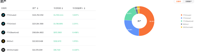 在这里你可以清楚的知道各家交易所资产余额及份额。当然,你也可以在右上角进行切换,查看交易账户资产的分布情况。