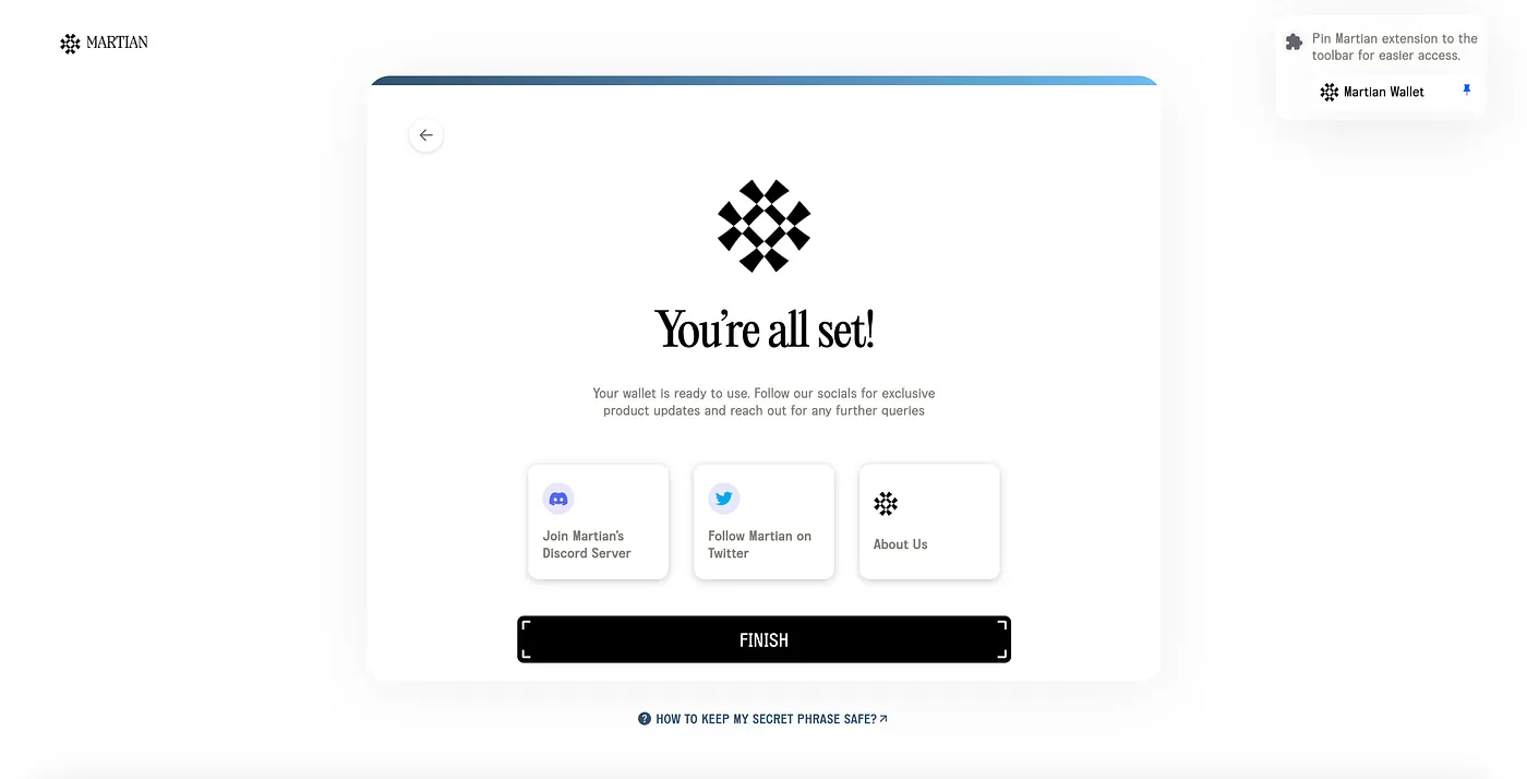 To make it easier to access your wallet, pin the Martian Wallet extension to your browser. This will allow you to quickly access your wallet whenever needed.