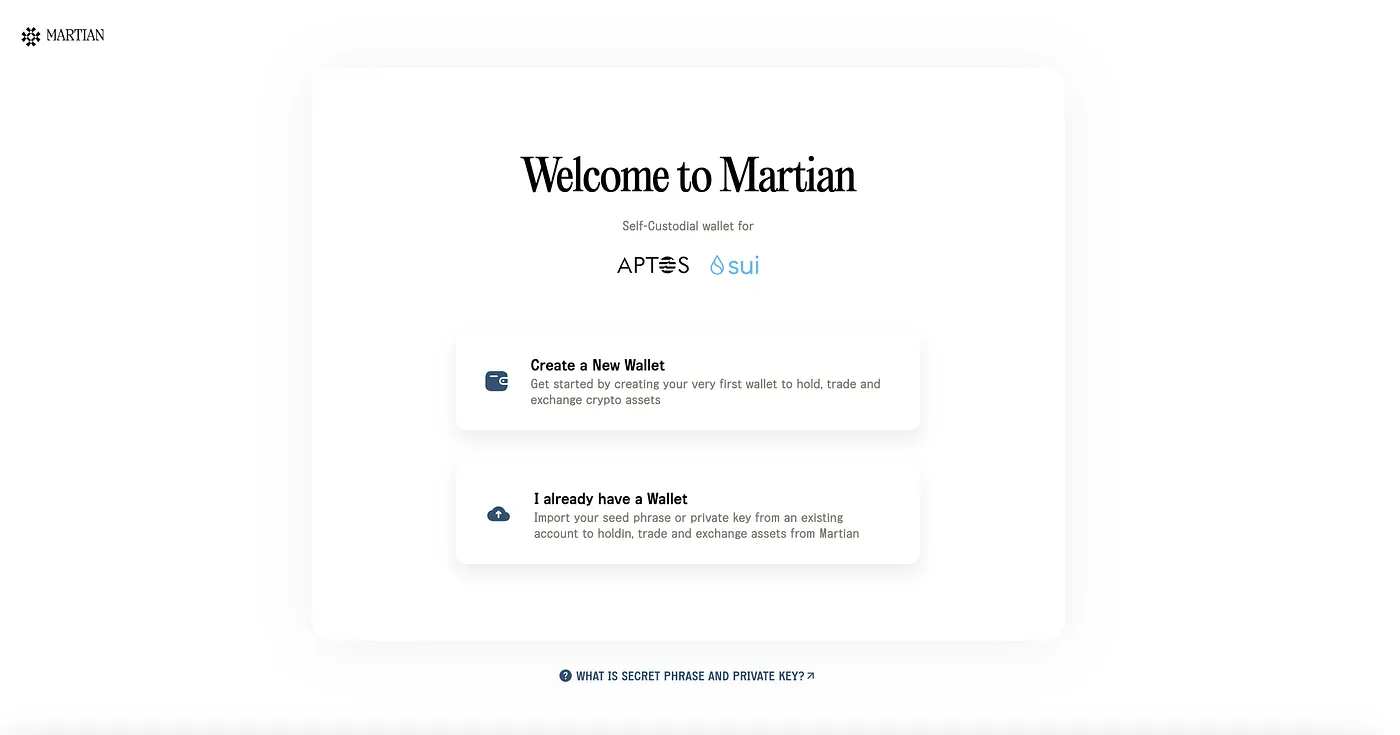 After downloading the Martian Wallet Sui extension, you will land on a screen where you can choose to create a new wallet or import an existing wallet using your seed and private key. Chose to create a new wallet if you don’t have an existing wallet.