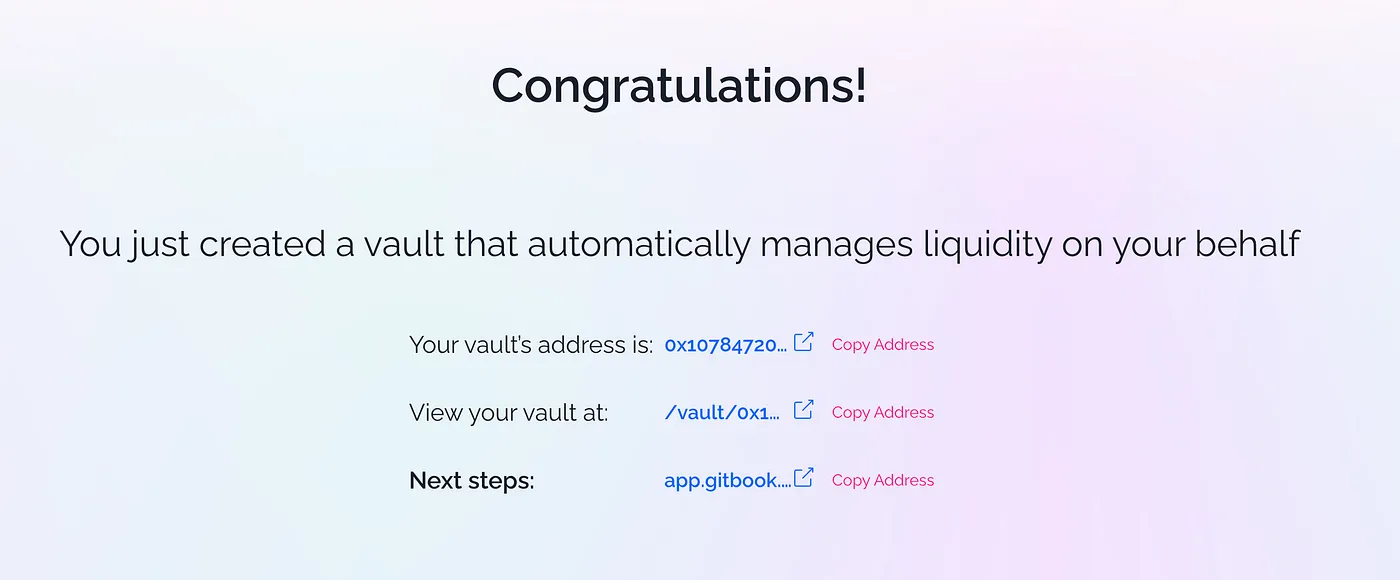 There you have it, you now have your own fully functioning LP vault that lives 24/7 on the blockchain! It has everything you need to earn yields, increase liquidity, earn manager fees, track performance, and much more….