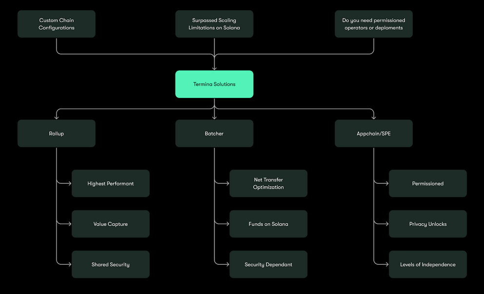 Through Termina, benefits and infrastructure from the SVM can be leveraged into new rollups, batcher, or appchains. A custom stack is offered for each of these: