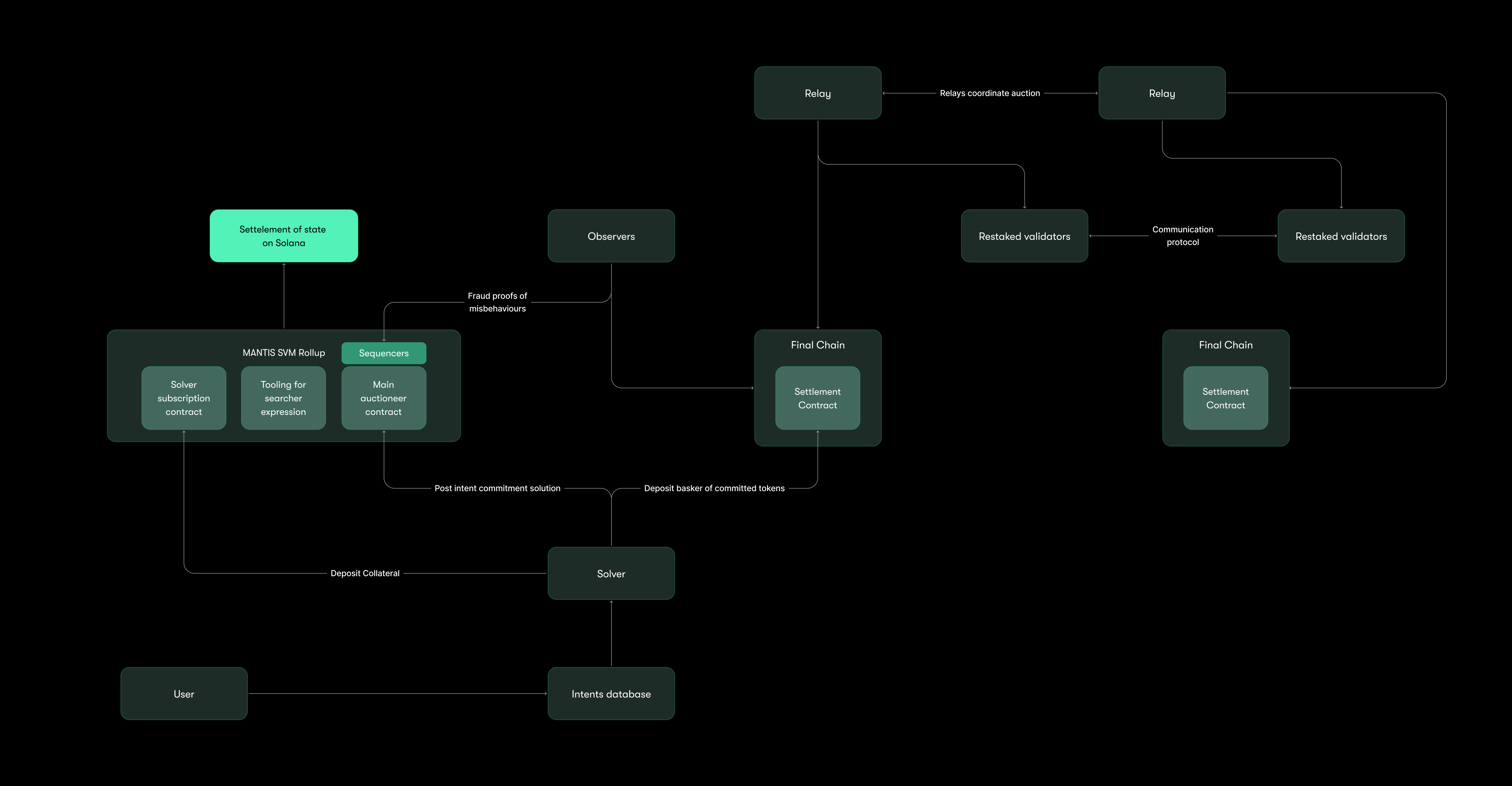 Users with LSTs from SOL native staking on MANTIS can opt into staking these tokens in Picasso’s Restaking Layer. Tokens that have been restaked in this layer will be used to secure the sequencers of the MANTIS Solana-based rollup. The rollup is decentralized with a rotating set of independent sequencers that ensures censorship-resistance. This is critical for guaranteeing intents and solutions are accepted before the end of the scoring period, maintaining the credibility of scoring and facilitating blockspace auctions. This is done similarly to AltLayer’s restaked rollup design, which incorporates decentralized sequencing into a rollup’s architecture. This ensures that transaction inclusion on layer 1 is not done in a malicious way, allowing our solvers to crowdsource their collateral.