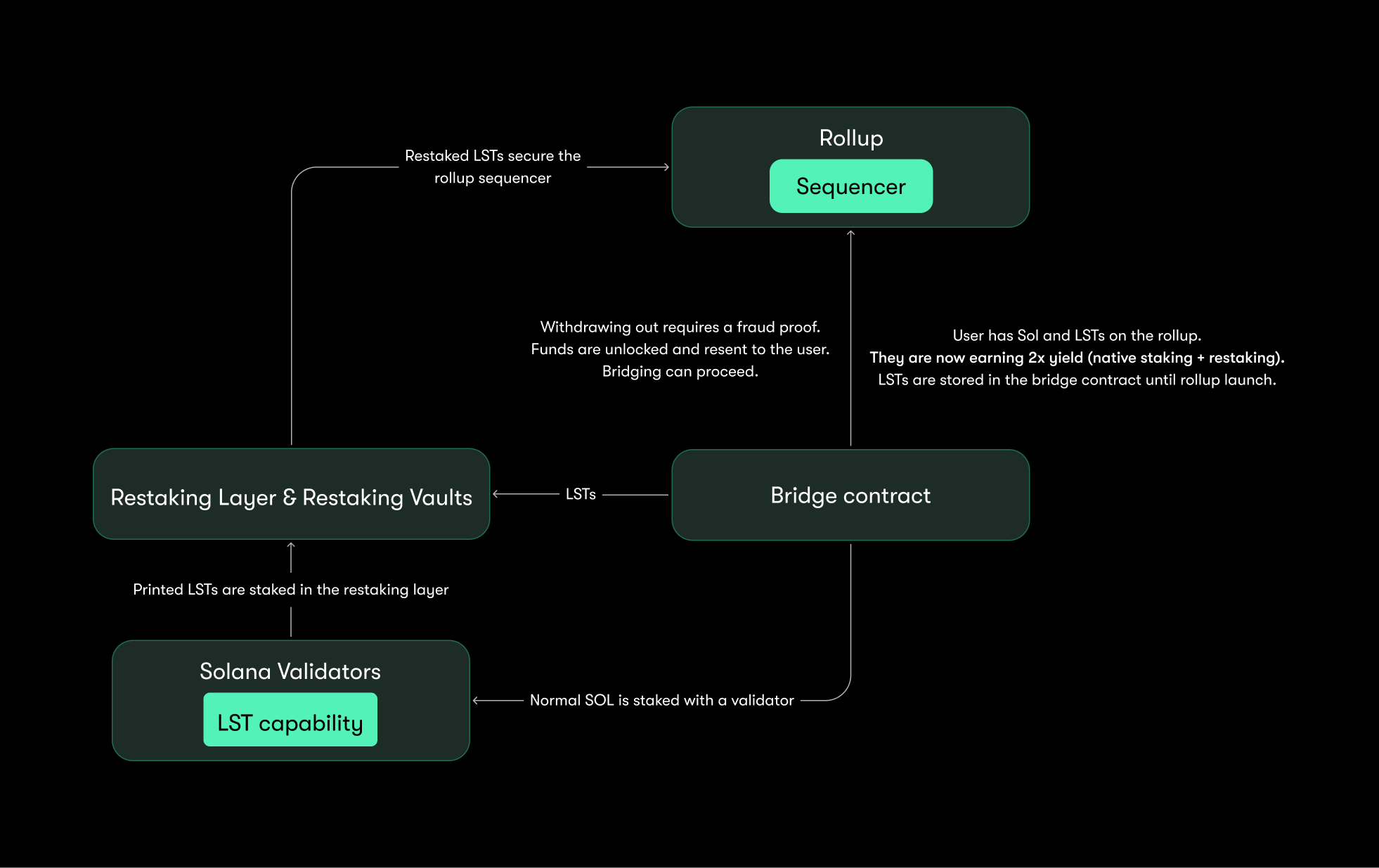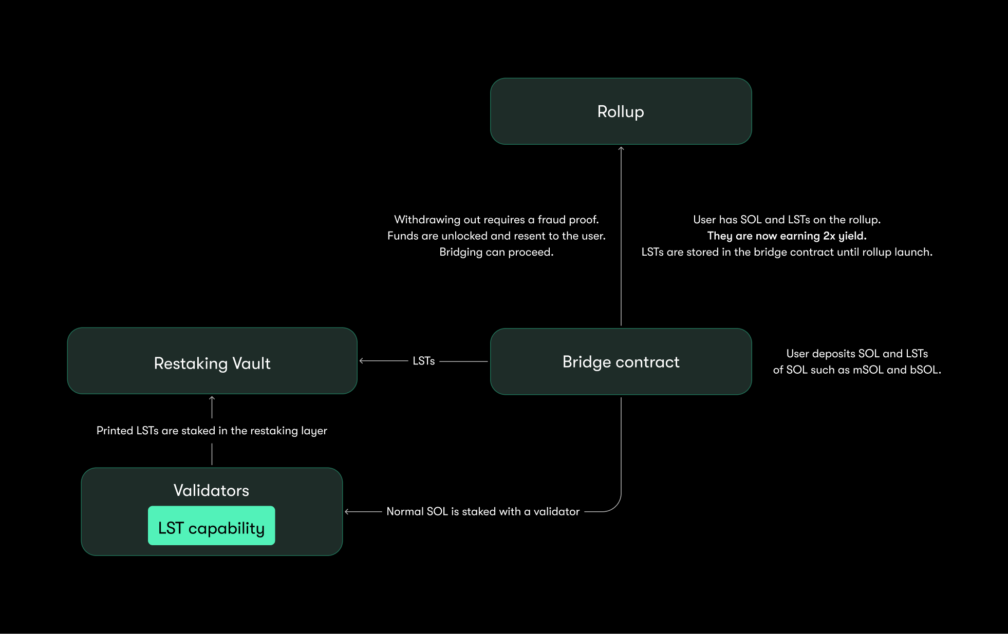 As shown in the above diagram, the bridge contract interacts with the rollup. Users deposit SOL as well as a number of liquid staked tokens (LSTs) from SOL into this bridge contract.