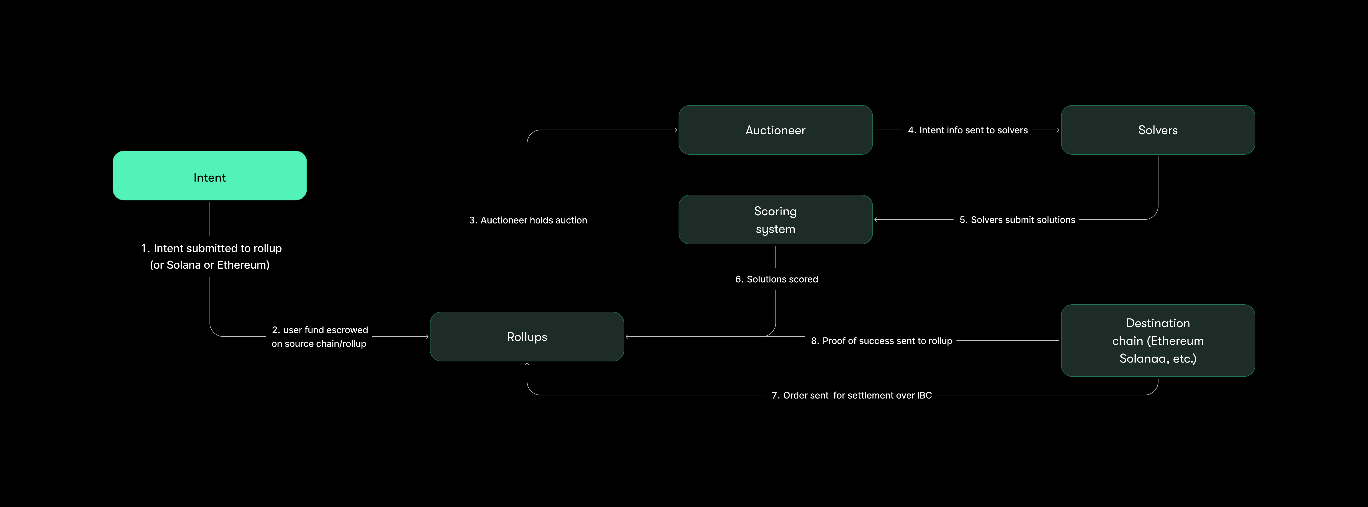 Intents are submitted to the Mantis interface (via the Mantis rollup directly or via another IBC-connected chain like Solana or Ethereum), enabling users to express preferences for a cross-chain transaction.