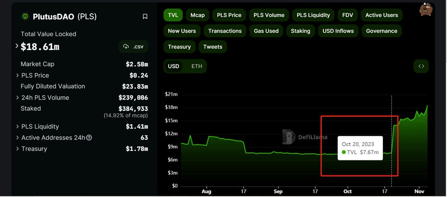 我带你看看更加详细的数据,数据显示,PlutusDAO的TVL从10.20日开始上涨,